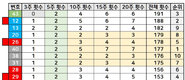 전체적으로 분석했을 때, 제가 생각하는 예상번호는 번호 왼쪽에 빨간색 태그가 붙여진 번호들입니다. 이 번호는 전체 횟수 그룹까지 비교한 결과입니다.